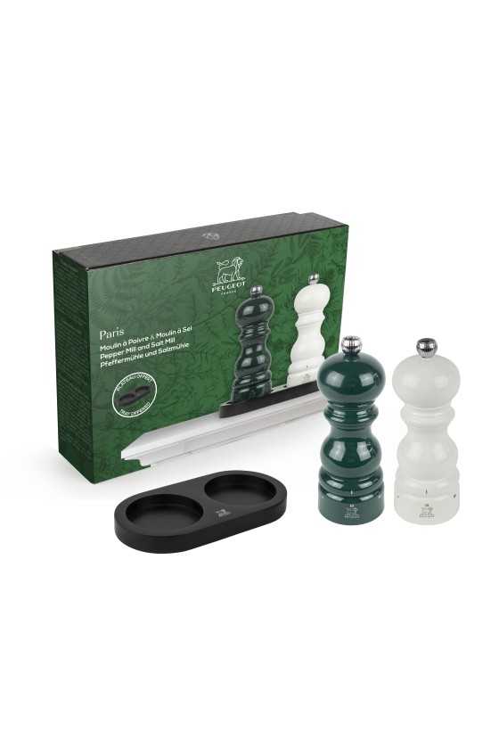 Gift packaging with a Duo of the Paris u'Select Paris 15 cm salt and pepper mills, with a black bamboo tray.