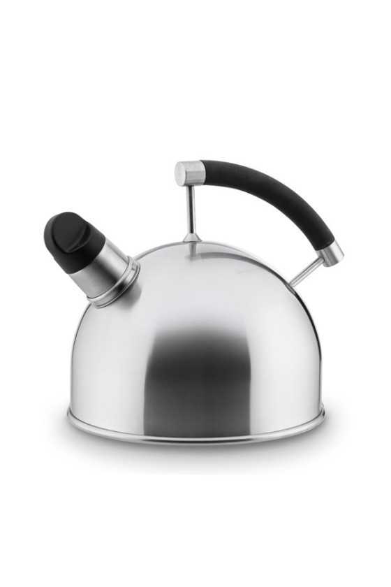 Durable stainless steel kettle with lid, stylish black design, convenient black handle, capacity 2.50 liters.