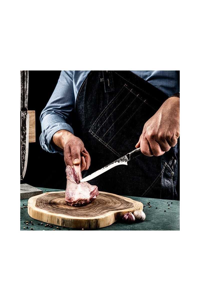 The Forged Brute boning knife is super sharp, allowing you to perfectly bone meat and remove fat or tendons. All Forged Brute knives are handmade from Japanese steel and have a rugged appearance due to the hammered unpolished steel. The knife feels comfortable in the hand and is packaged in a sturdy wooden box. The Forged Brute boning knife has an open bolster and a flexible 11.5cm blade.