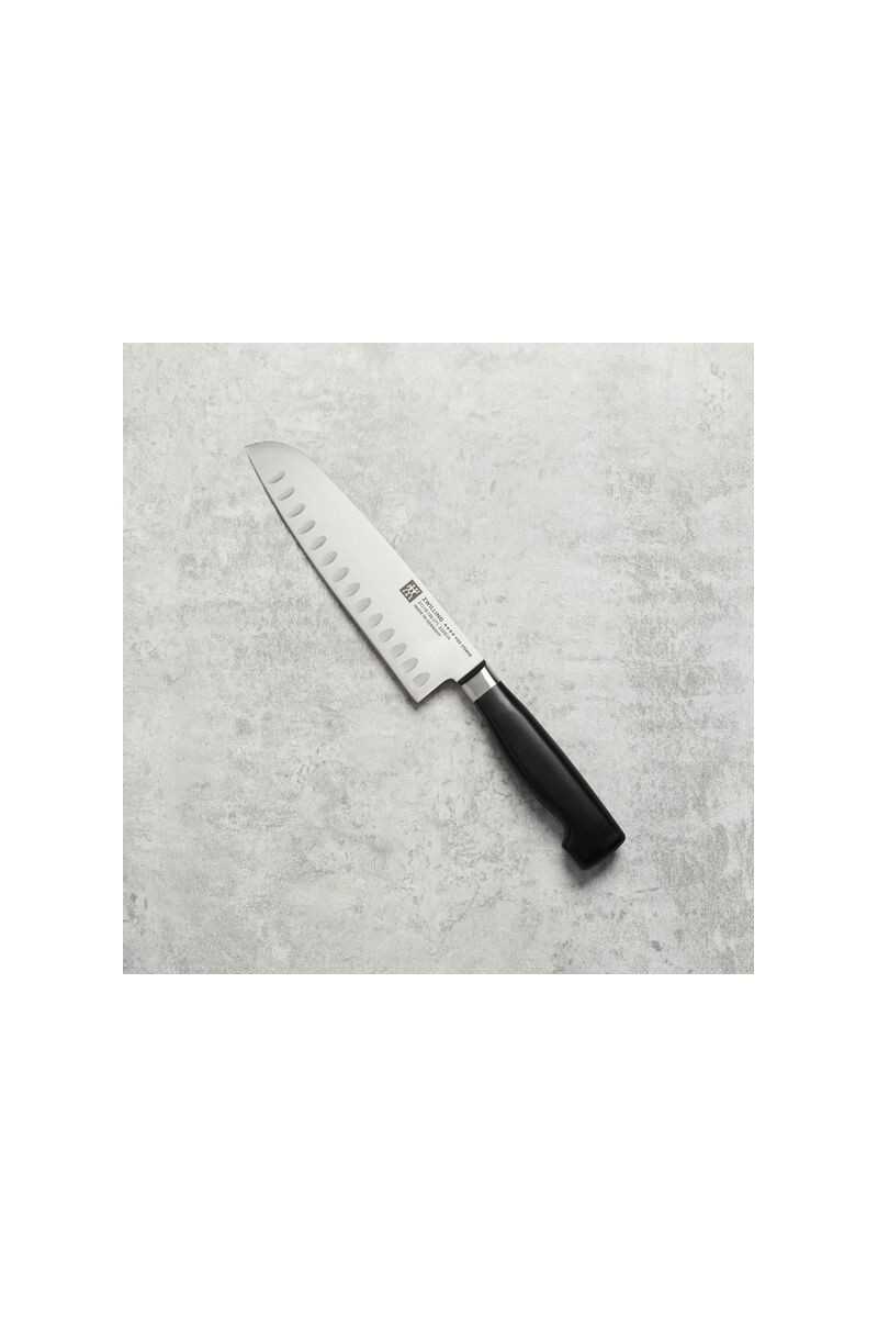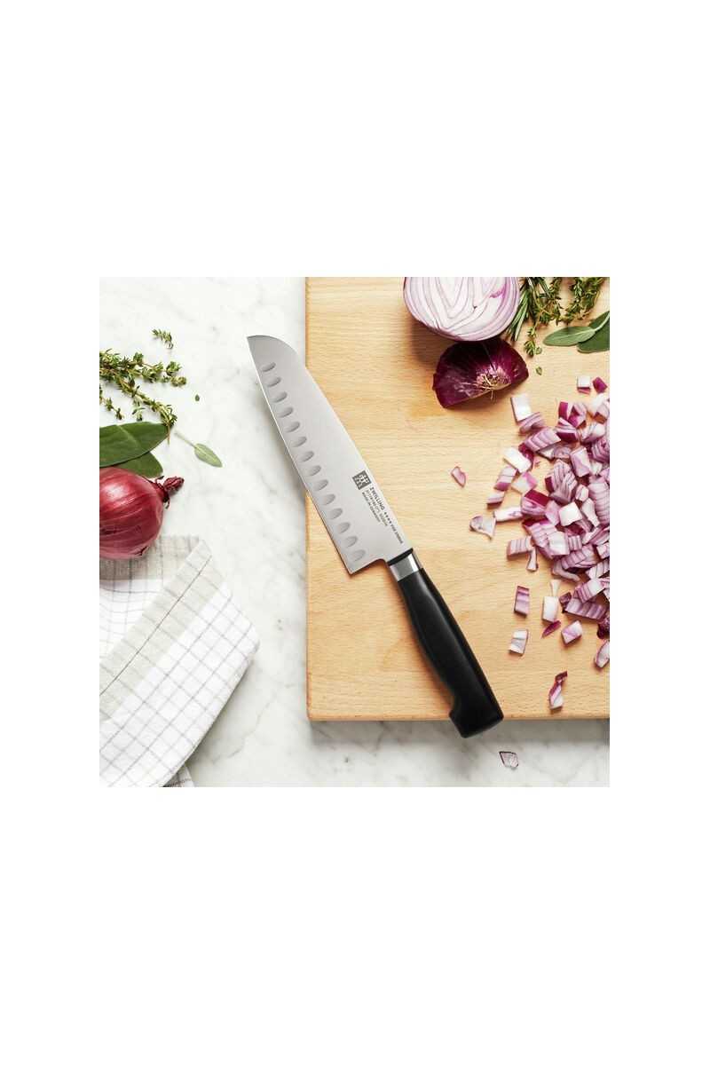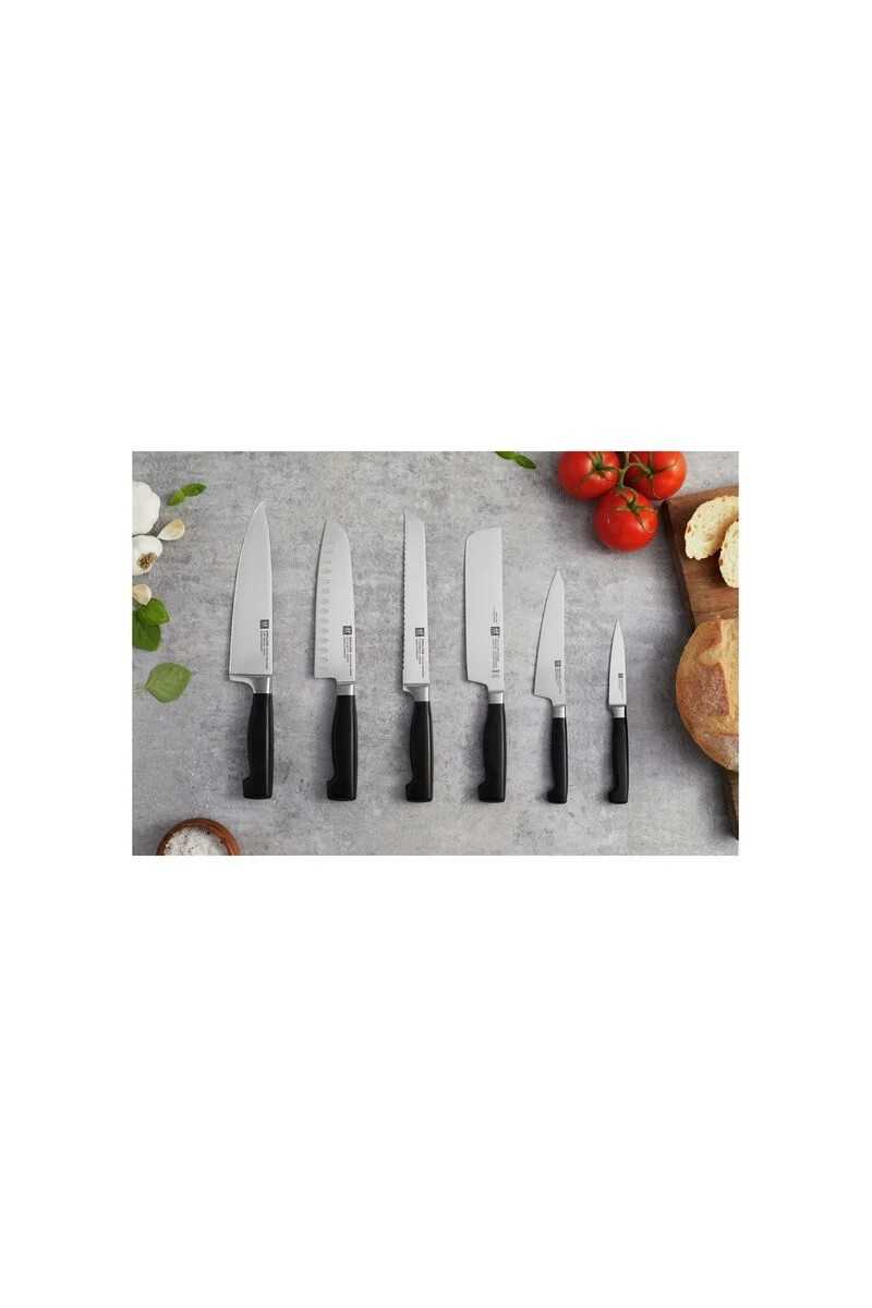 Veertig jaar geleden legde ZWILLING de lat voor uitmuntende messen een beetje hoger door de ontwikkeling van de naadloze synthetische greep. Dit meesterwerk van veiligheid, ergonomie en comfort is wereldwijd uitgegroeid tot de best verkopende messenserie van ZWILLING. De stevige, evenwichtige en flexibele lemmeten van de Four Star-messen zijn vervaardigd uit één stuk staal. Dankzij de naadloze overgang tussen steun en greep liggen de Four Star-messen comfortabel in de hand, zelfs bij langdurig gebruik. Made in Germany.