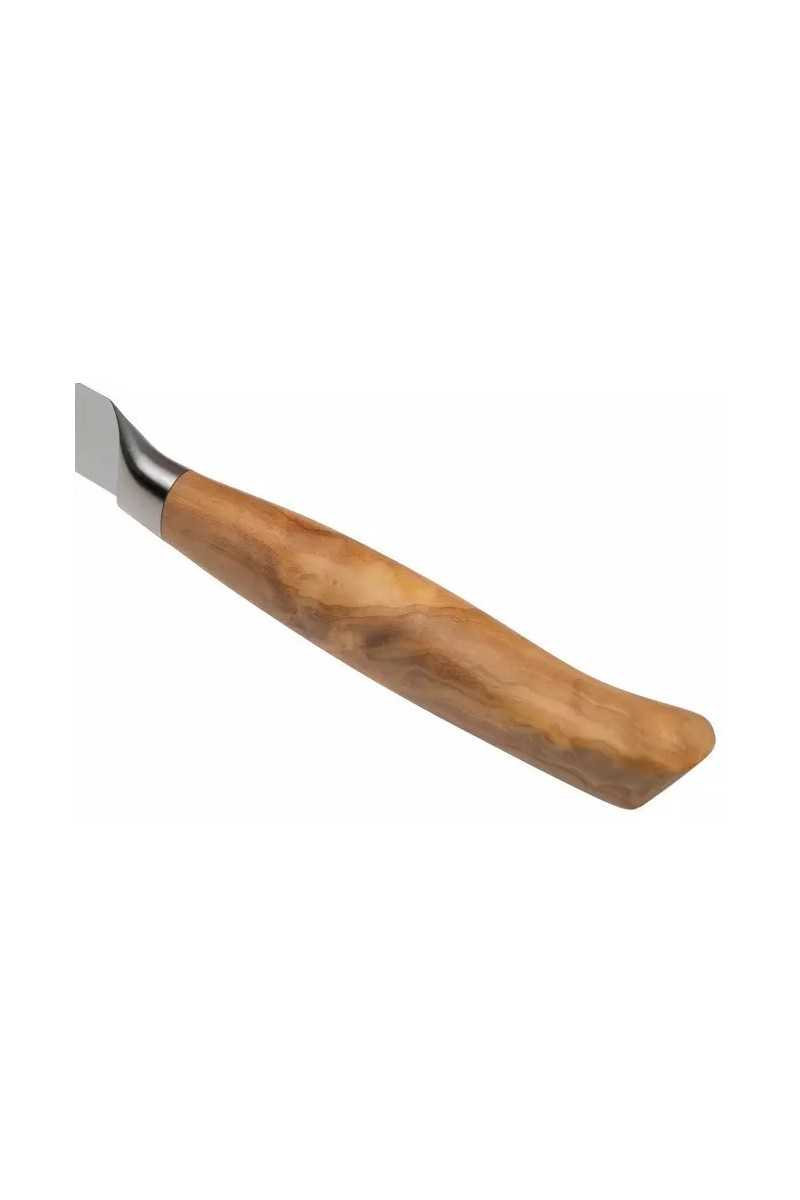 The handles of the knives are made from Mediterranean olive wood. The light brown wood has a wild grain with dark brown lines. Thanks to the handles with rounded corners, the knives are comfortable to hold. Since olive wood is a natural product, the handle of each knife is unique! Besides the fact that olive wood looks beautiful, it is also a very durable type of wood. Because olive trees grow very slowly, the wood has a high density. Olive wood is an oil-rich type of wood. This makes the wood naturally water-repellent. Stains and discolorations from food do not occur quickly on olive wood either. To keep the handle looking beautiful for as long as possible and to avoid damaging it, it is important not to put the knife in the dishwasher. Wash it by hand immediately after use and dry the knife right away.