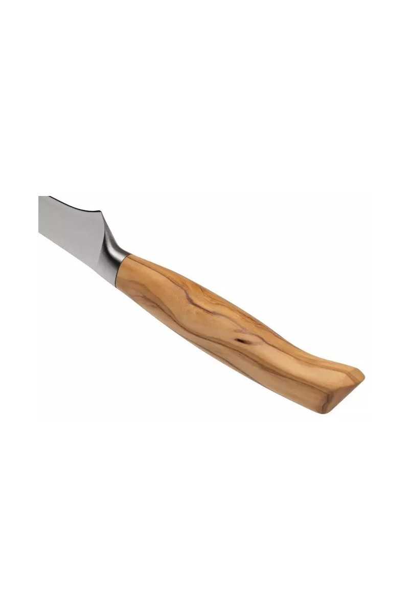 The handles of the knives are made from Mediterranean olive wood. The light brown wood has a wild grain with dark brown lines. Thanks to the handles with rounded corners, the knives are comfortable to hold. Since olive wood is a natural product, the handle of each knife is unique! Besides the fact that olive wood looks beautiful, it is also a very durable type of wood. Because olive trees grow very slowly, the wood has a high density. Olive wood is an oil-rich type of wood. This makes the wood naturally water-repellent. Stains and discolorations from food do not occur quickly on olive wood either. To keep the handle looking beautiful for as long as possible and to avoid damaging it, it is important not to put the knife in the dishwasher. Wash it by hand immediately after use and dry the knife right away.