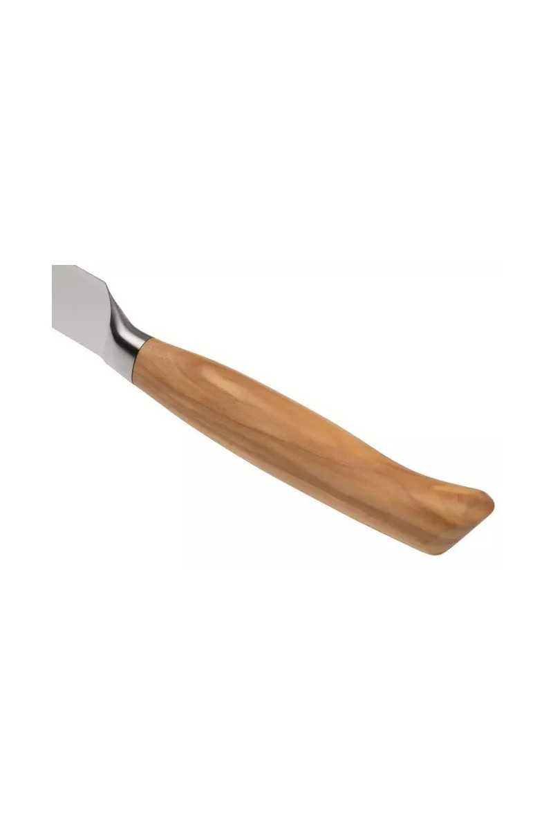 The handles of the knives are made from Mediterranean olive wood. The light brown wood has a wild grain with dark brown lines. Thanks to the handles with rounded corners, the knives are comfortable to hold. Since olive wood is a natural product, the handle of each knife is unique! Besides the fact that olive wood looks beautiful, it is also a very durable type of wood. Because olive trees grow very slowly, the wood has a high density. Olive wood is an oil-rich type of wood. This makes the wood naturally water-repellent. Stains and discolorations from food do not occur quickly on olive wood either. To keep the handle looking beautiful for as long as possible and to avoid damaging it, it is important not to put the knife in the dishwasher. Wash it by hand immediately after use and dry the knife right away.