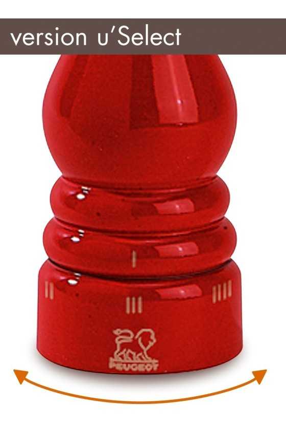 The u'Select Paris pepper mill, lacquered in fiery red, 18 cm, stands out immediately and elevates your dishes to an unseen level in no time. This manual pepper mill is entirely made in France. The wood for the casing comes from local PEFC-certified forests. The u'Select ring at the base of the mill allows you to set the grind size with great precision. This way, you can choose how fine or coarse you want to grind. There are 6 grind settings: from 1 (very fine) to 6 (coarse).