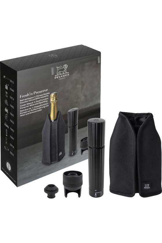 Geschenkverpakking met Frizz Uitschuifbare wijn- en champagnekoeler en Preserve Duo Bewaarpomp voor wijn en mousserende wijn met dubbele functie