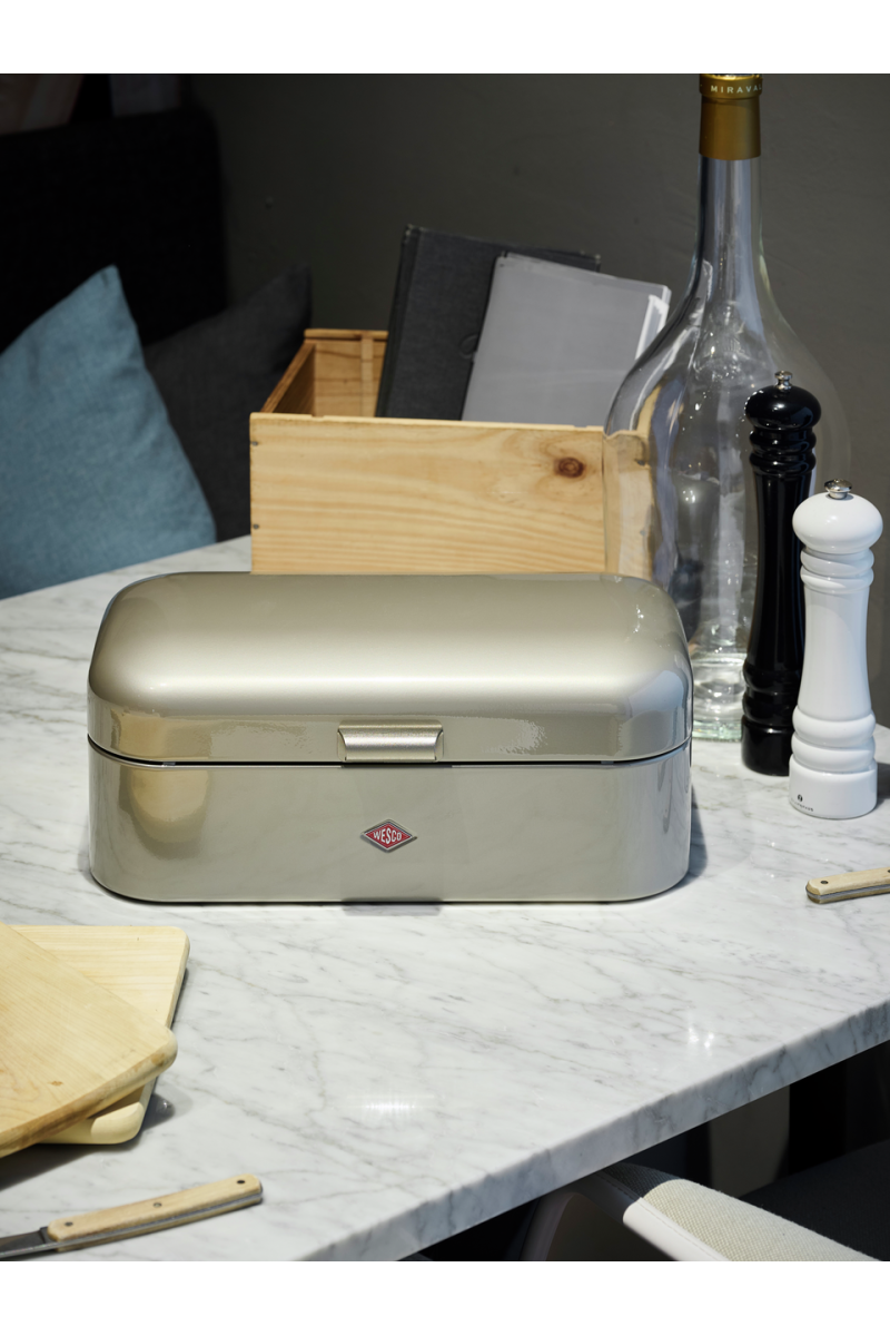 De Grandy® brooddoos is een echte Wesco-klassieker. De naam verwijst naar “Grandma”, omdat veel mensen dit herkenbare model nog kennen uit de keuken van hun oma. Een retro-icoon dus, maar dankzij de strakke lijnen staat hij ook verrassend modern op het aanrecht. Er is volop ruimte voor een groot brood, maar ook voor cake of gebak—ideaal voor het hele gezin. Aan de achterkant zitten ventilatiegaatjes voor een goede luchtcirculatie, zodat de inhoud langer vers blijft. Het deksel is bevestigd met stevige metalen scharnieren en ook het handvat is gemaakt om tegen een stootje te kunnen. En natuurlijk is de Grandy® verkrijgbaar in allerlei mooie Wesco kleuren.