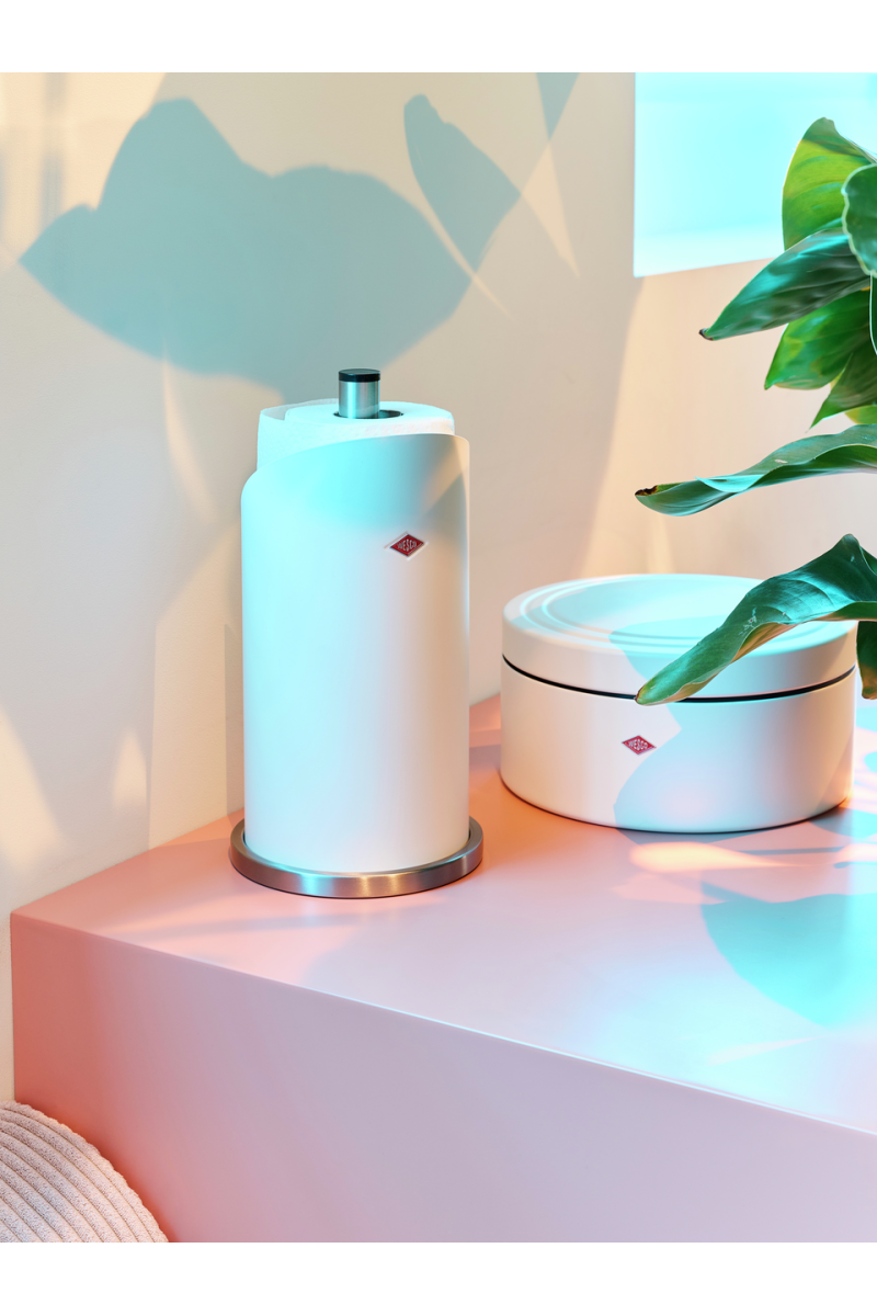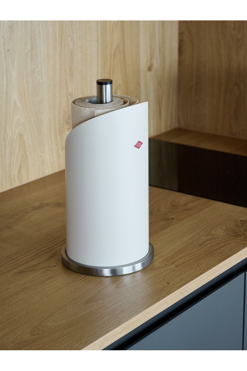 Heeft jouw keukenrol nog geen vaste plek in de keuken? Dan is deze stijlvolle en praktische rolhouder van Wesco precies wat je nodig hebt. Gemaakt van een combinatie van roestvrij staal en gelakt plaatstaal, past hij perfect bij de herkenbare Wesco-stijl.