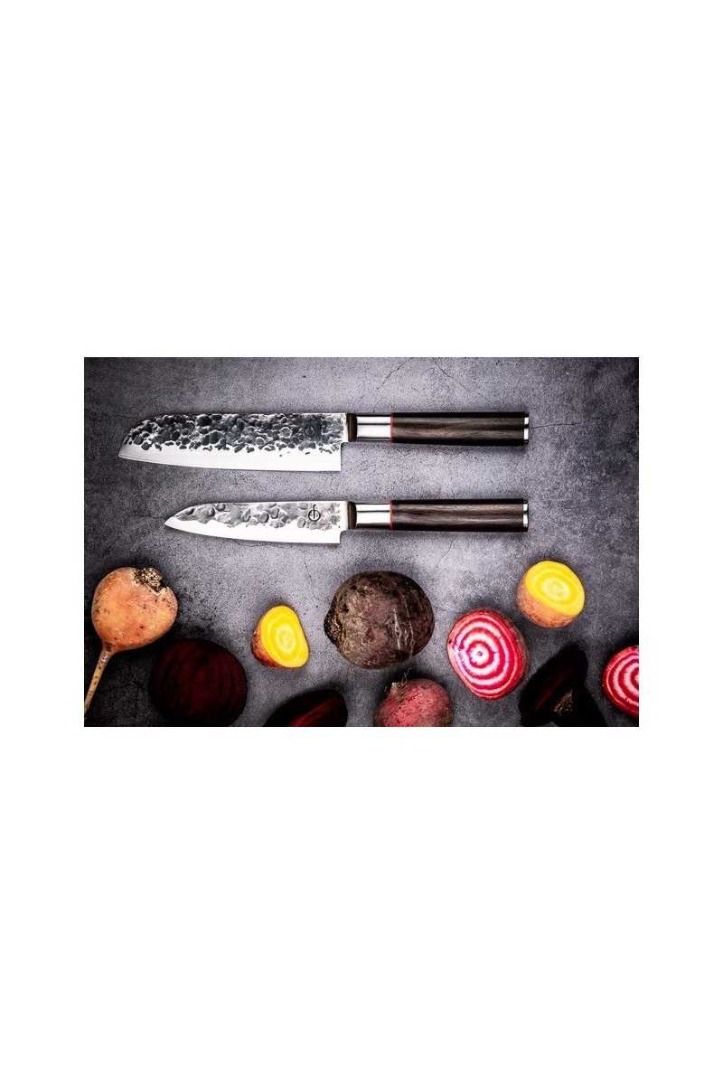 Het Forged Sebra Santokumes 14cm is een chique en stoer mes tegelijk. Een Santokumes is een Japans koksmes. Santoku betekent drie deugden (fijnsnijden en dobbelsteentjes en plakken snijden). Het 14cm lange lemmet van dit Forged Sebra Santokumes leent zich hier perfect voor. Het mes is handgemaakt van Japans staal en prachtig Afrikaans Sebra hout. Het lemmet is vlijmscherp en herkenbaar door het robuuste gehamerde uiterlijk. Het mes wordt geleverd in een fraai gebrand houten kistje.