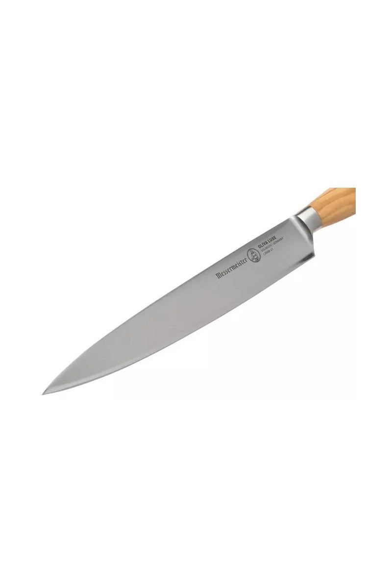 Het Messermeister Oliva Luxe vleesmes is een stijlvol en praktisch keukenmes. Het 21 cm lange lemmet stelt je in staat om lange snijbewegingen te maken. Het lage lemmet zorgt ervoor dat plakjes minder snel aan het lemmet blijven plakken. Hierdoor snijd je gemakkelijk dunne plakjes vlees zonder dat ze scheuren. De scherpe punt is ideaal voor kleine, delicate klusjes zoals het verwijderen van pezen en vet van stukken vlees.